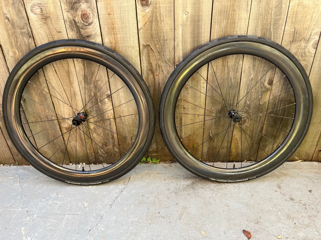 The tires are GP5000 S 30mm on the rear and GP5000 AS 28mm on the front. The front tire looks like it could have been a little narrower for a more aero rim profile.